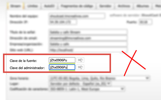 La clave fuente la utilizas para conectarte al servidor desde encoder, y la clave de administrador para iniciar sesión en el panel de control. Cuando guardas la clave en el navegador, éste por defecto modifica la clave fuente, provocando que tanto la clave de administrador (la que guardaste en el navegador) y la clave fuente sean las mismas.